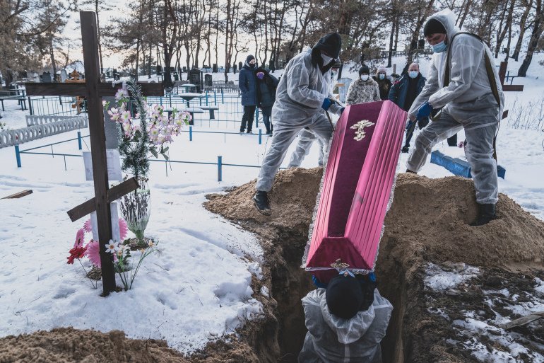 Весь процес – від виходу з моргу до поховання – відбувається дуже швидко. Ми йдемо за трунарями і родичами на кладовищі, де вони дістають труну з машини, їхні білі захисні костюми зливаються зі снігом на могилах. Вони просять родичів залишатися в декількох метрах від них.