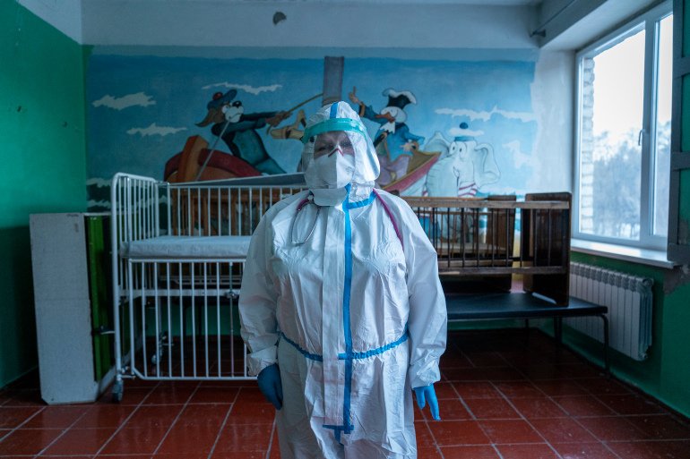 Сьогодні білосніжна швидка допомога проїжджає по брудних калюжах під дощем, який падає на дороги, пошкоджені військовою технікою. Усередині знаходиться Ірина Гужин – єдиний лікар для 2500 осіб – і її медсестра їдуть оглянути в своєму будинку видужуючих від коронавірусу чоловіка і його дружину.