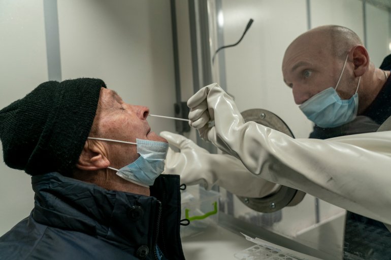 Біля однієї з кабінок для тестування, 63-річний Сергій Богатирьов сидить в інвалідному візку і палить цигарку, поки його дружина реєструється і платить касиру. Співробітник лабораторії протискується через чергу і просить його викинути сигарету перед тестуванням. Його інвалідний візок, як з’ясувалося, не поміщається в крихітній кабінці, тому він проходить тестування на відкритому повітрі, серед натовпу людей і бездомних собак.
