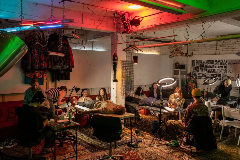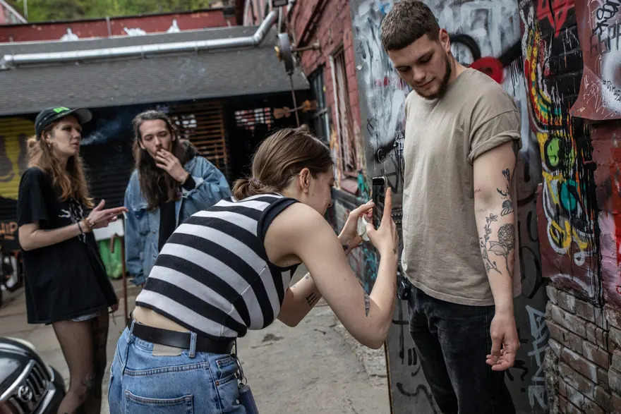 Кілька субот поспіль вона проводила в групі тату-майстрів, які збиралися в київському тусовочному районі на день збору коштів у нічному клубі, який нині не працює через війну та комендантську годину.