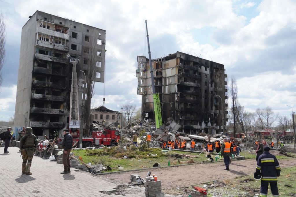 У зруйнованому мікрорайоні міста Бородянка, що за 55 кілометрів на захід від столиці Києва, на будинку висить банер із написом «Ми тут живемо 40 років». Інший банер «прибери сміття – відремонтуй наші квартири».