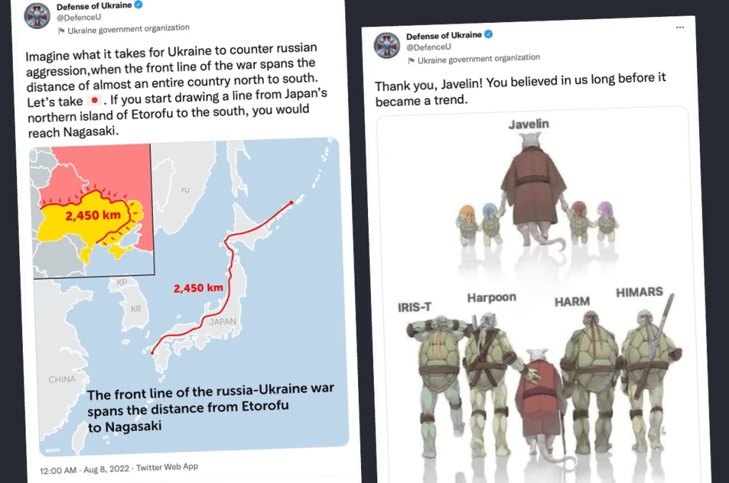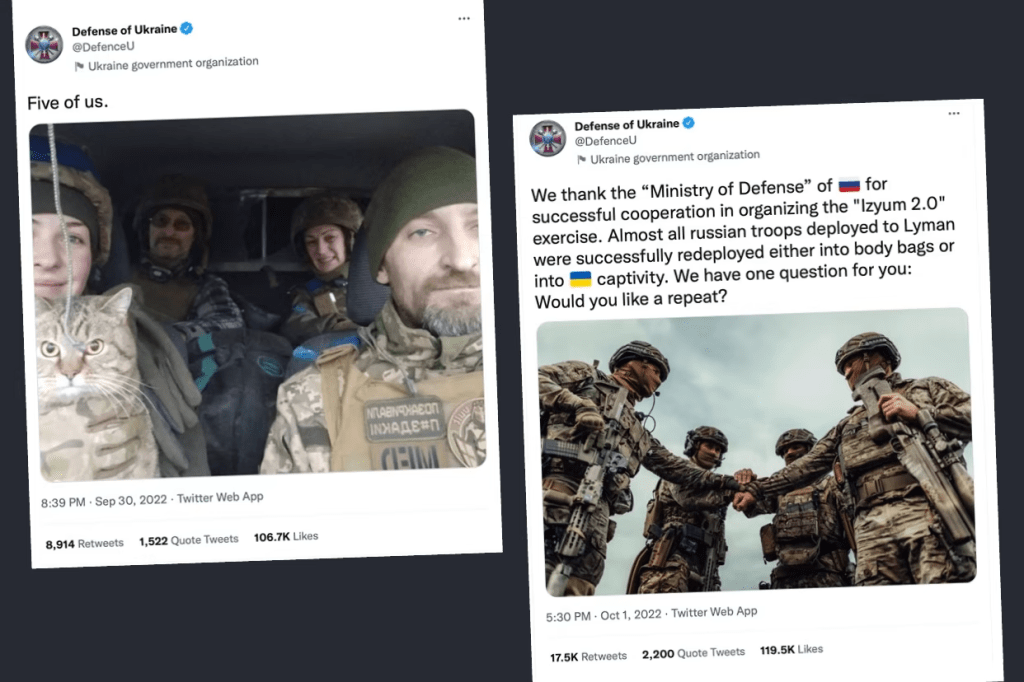 Акаунт Міністерства оборони України почергово публікує похмурі нагадування про те, яких втрат завдала війна Україні разом із хитро створеними та часто нешанобливими повідомленнями. Це формує наратив про те, що українці стоїчні на війні, стримані у складних обставинах і великодушні на шляху до перемоги, яка стала можливою завдяки західній зброї. Дописи поширюються у Twitter серед цільової аудиторії — осіб, які ухвалюють міжнародні рішення, впливових журналістів і звичайних проукраїнських західників. Навіть коли витрати на енергію стрімко зростають по всій Європі, такі акаунти допомагають українським військовим заручитись народною підтримкою.