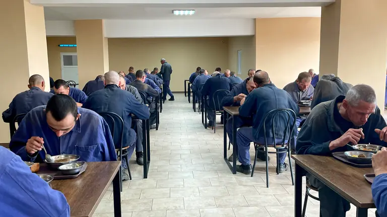 В’язні, які пообідали, встають, складають руки за спиною і хором кажуть «Дякуємо за обід» українською мовою. Чоловіки їдять позмінно, і черга тягнеться від прилавка з їжею вниз по сходах і аж до подвір’я. На високих кам’яних стінах із колючим дротом висять фотографії українських діячів минулих століть та всіх попередніх президентів з моменту здобуття незалежності.