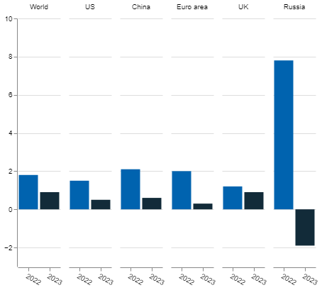 До російського вторгнення, наприкінці 2021 року, Світовий Банк передбачив, що приріст до ВВП в Росії на наступний рік становитиме 4,3%. Враховуючи фактичне падіння діапазону між 4,5% до 2,1% у 2021 році, скорочення ВВП становить від 7% до 10%.