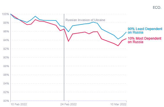 В середньому торговельні зв’язки з Росією призвели до зниження вартості загального індексу фондового ринку кожної країни на 1,53%, як свідчить дослідження Лондонської школи економіки. До війни середній рівень залежності компаній від Росії становив 0,25%. Це означало, наприклад, що компанія з виробництвом товарів на суму 1 мільярд доларів матиме обсяг експорту та імпорту до та з Росії на загальну суму 2,5 мільйона доларів.
