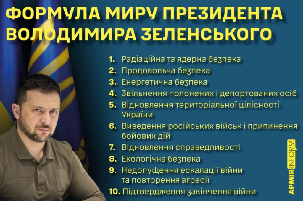 2022 року президент України Володимир Зеленський вперше виклав свою формулу миру. Він висунув ідеал не лише того, як закінчиться ця війна, а й того, як усі війни мають вестись і закінчуватися. З того часу український лідер та його уряд деталізували бачення у 10 пунктах. Це: радіаційна та ядерна безпека; Продовольча безпека; енергетична безпека; звільнення всіх ув’язнених та депортованих; відновлення територіальної цілісності України; виведення російських військ та припинення бойових дій; покарання за воєнні злочини; захист навколишнього середовища; гарантії безпеки та угода про припинення вогню. Одним словом, ці пункти включають не лише формулу припинення вогню та відповідальності, але й вимогу запобігти перетворення продуктів харчування та навколишнього середовища на зброю, а також процедури, що запобігають поновленню війни.