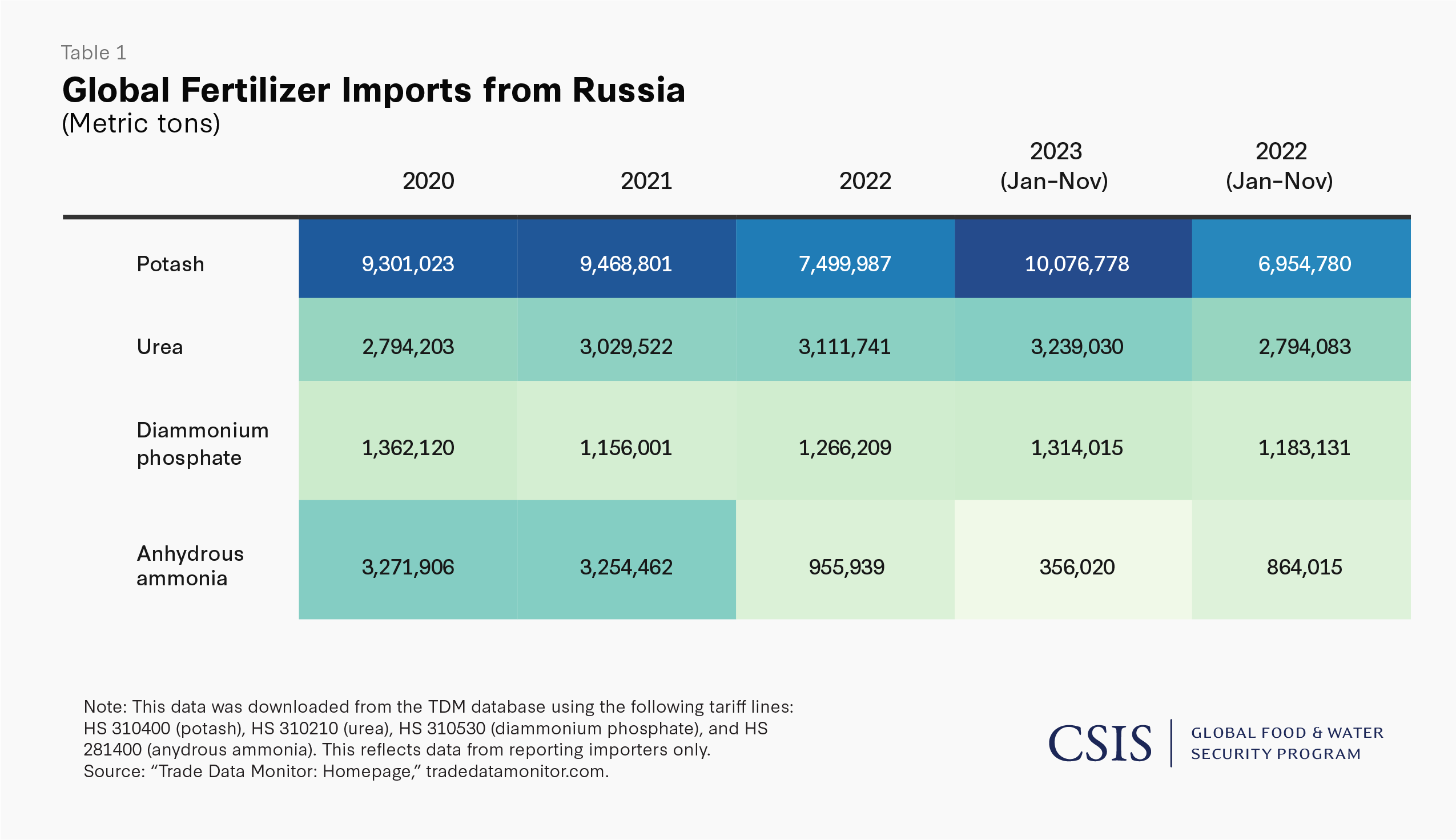 Вплив війни на експорт добрив з Росії було неоднозначним. За даними дзеркальної торгівлі, експорт калію знизився у 2022 році порівняно з рівнями 2020 та 2021 років, але різко збільшився у 2023 році. Експорт карбаміду та ДАФ зріс у 2022 році та у перші 11 місяців 2023 року. Навпаки, експорт безводного аміаку впав більш ніж на 70% у 2022 році та продовжив зниження у 2023 році. Це багато в чому відбиває наслідки закриття аміачного трубопроводу Тольяті-Южний і проблеми Росії із переміщенням експорту до портів Балтійського моря. На відміну від пшениці, де ключові дані про імпорт відсутні, дані дзеркальної торгівлі добривами зазвичай охоплюють 80–90% експорту на основі даних за 2020 та 2021 роки.