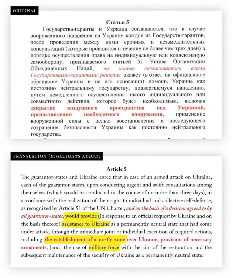 По-перше, тоді як комюніке та проект від 12 квітня 2022 року чітко давали зрозуміти, що держави-гаранти самостійно вирішуватимуть, чи приходити на допомогу Києву у разі нападу на Україну, у проекті від 15 квітня росіяни спробували підірвати цю найважливішу статтю, наполягаючи на тому, що такі дії відбуватимуться лише «з урахуванням рішення, узгодженого усіма державами-гарантами», що дає ймовірному загарбнику, Росії, право вето. Згідно з позначкою у тексті, українці відкинули цю поправку, наполягаючи на початковій формулі, згідно з якою усі гаранти мали індивідуальне зобов’язання діяти і не мали перед цим досягати консенсусу.
