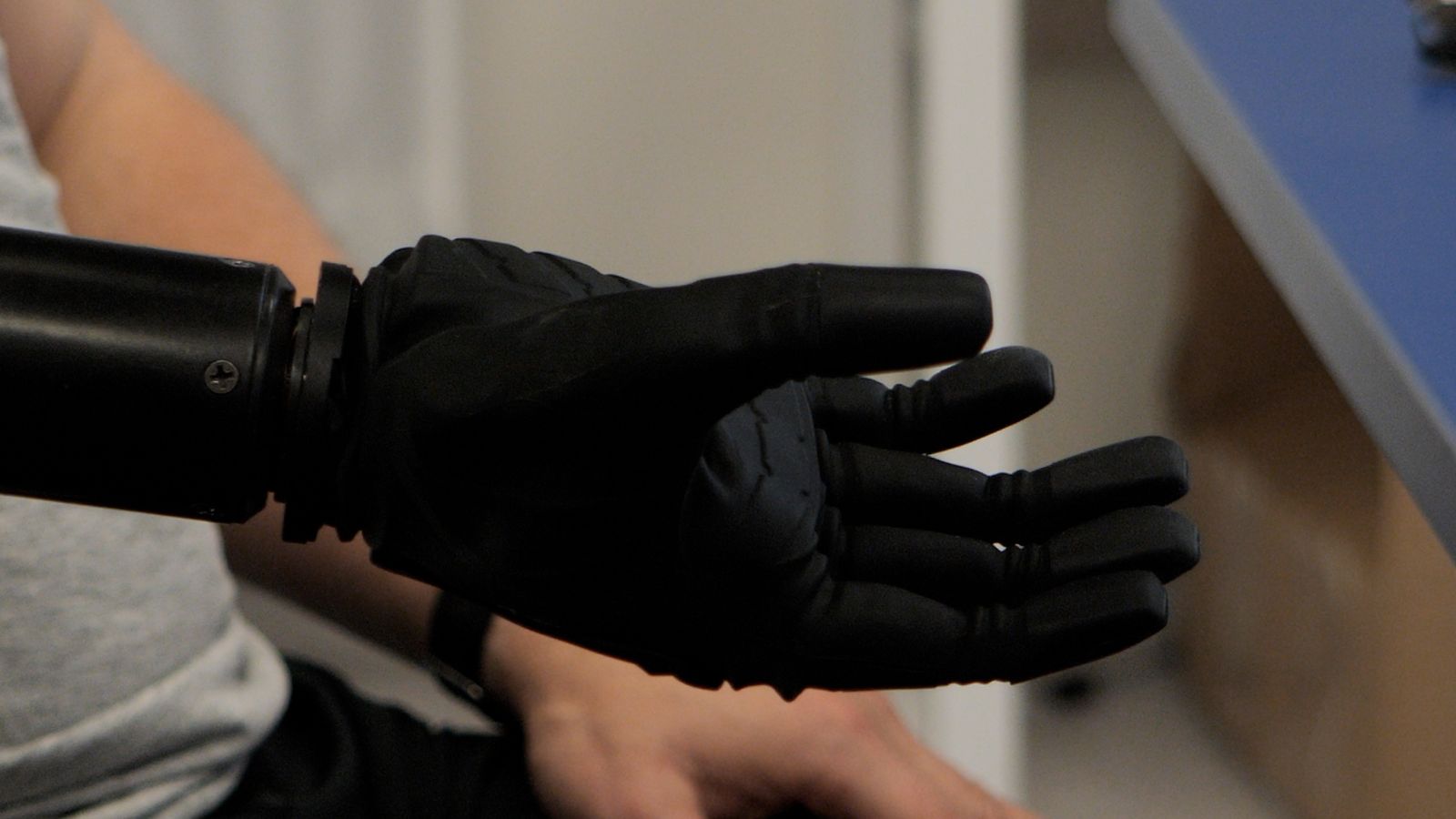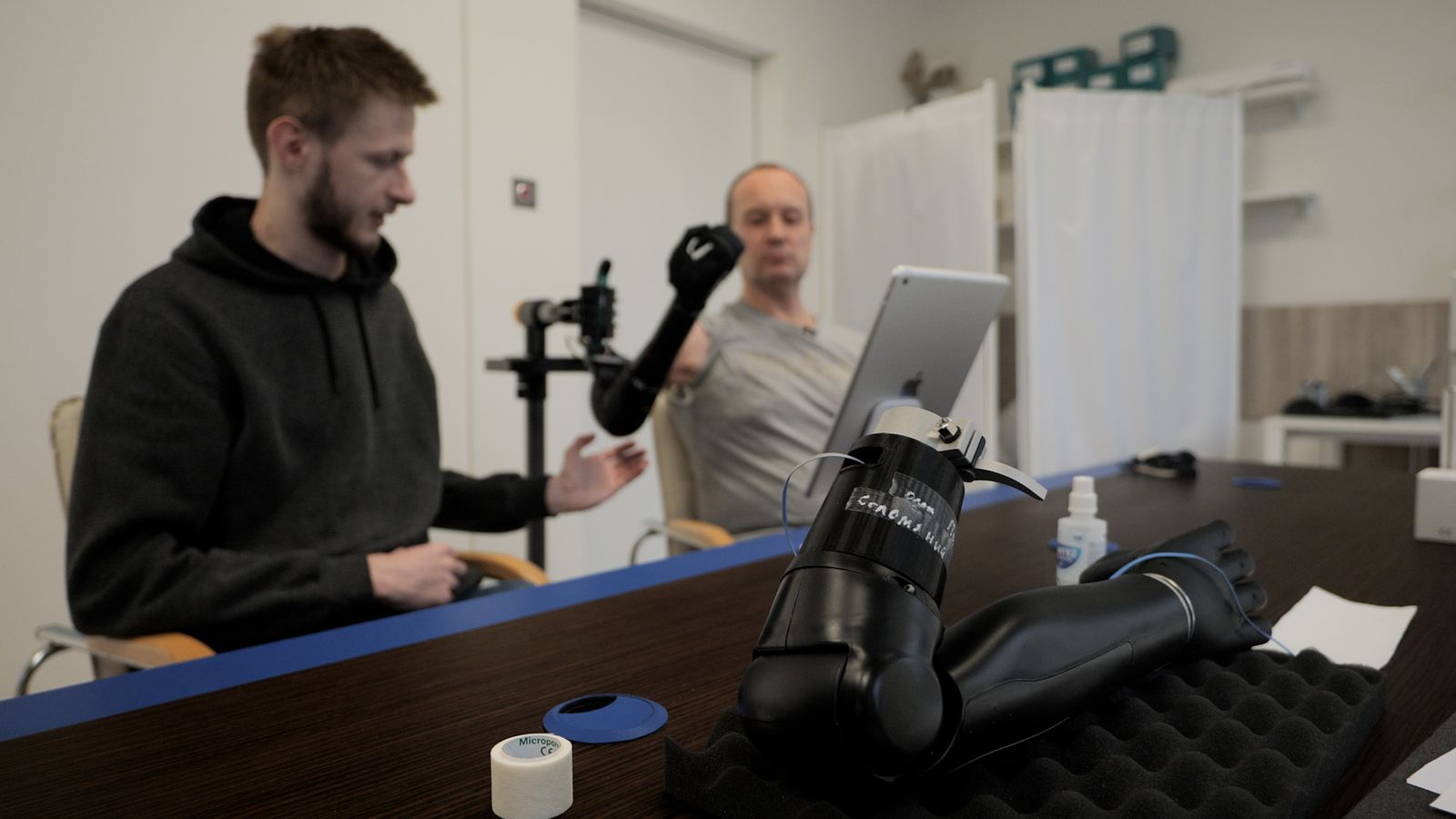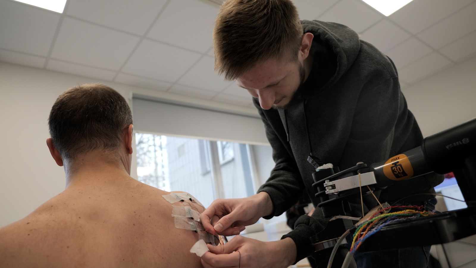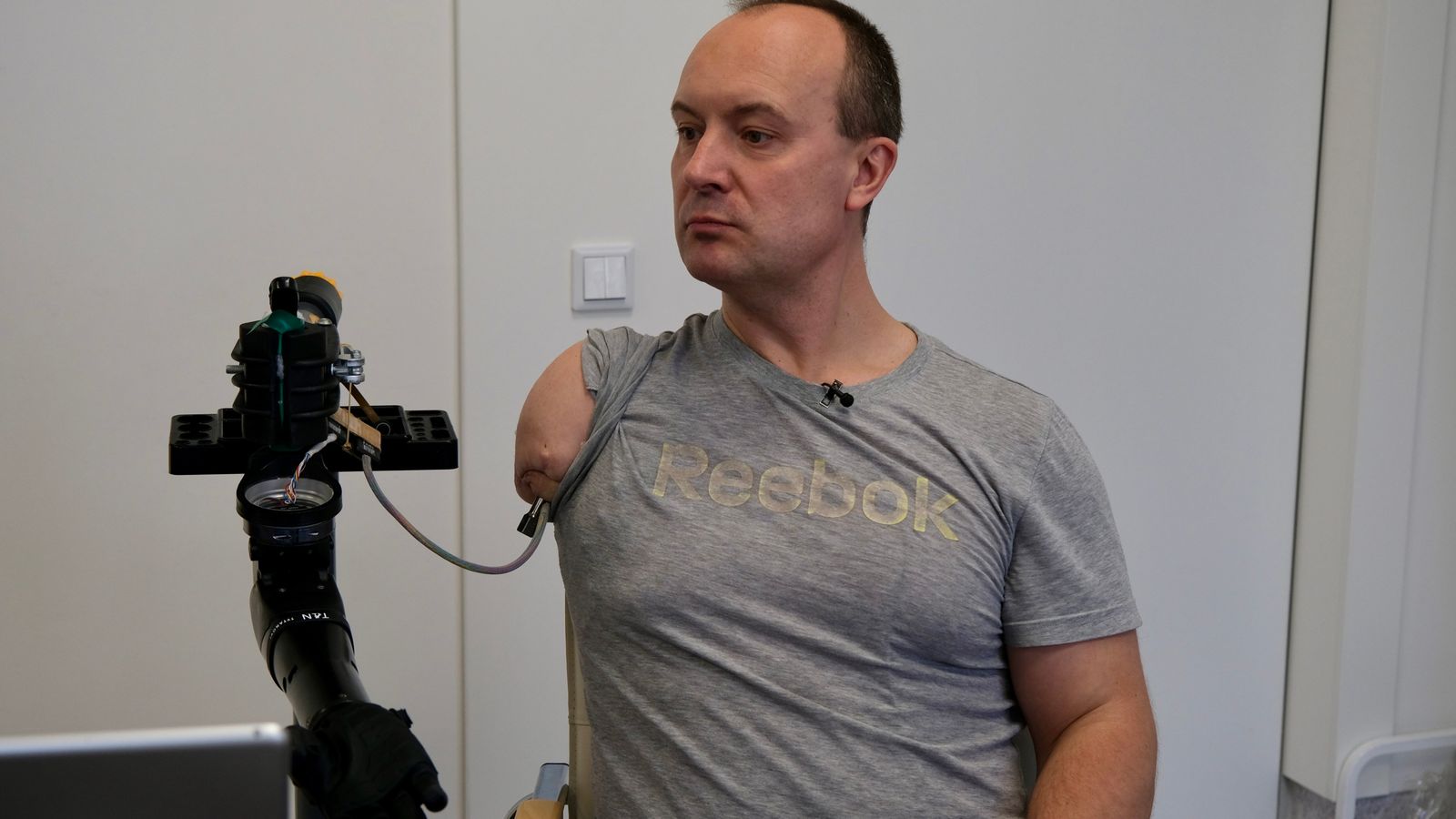 Олександр сідає та знімає футболку. Потім він знімає біонічну руку, щоб до ампутованої кінцівки, а також до м’язів грудей і спини, можна було приєднати сенсорні датчики.