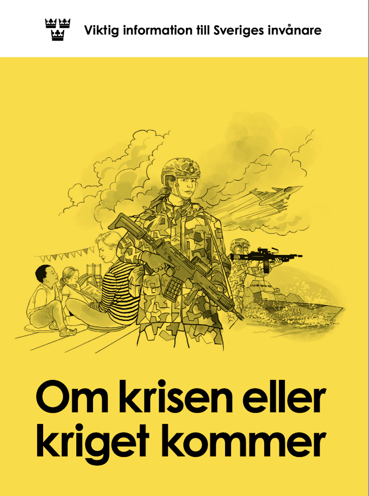 Шведська листівка «У разі кризи чи війни», яка доступна у цифровому форматі, також була розіслана 5,2 мільйонам домогосподарств. На жовтій обкладинці зображено двох озброєних солдатів, військовий корабель і винищувач.