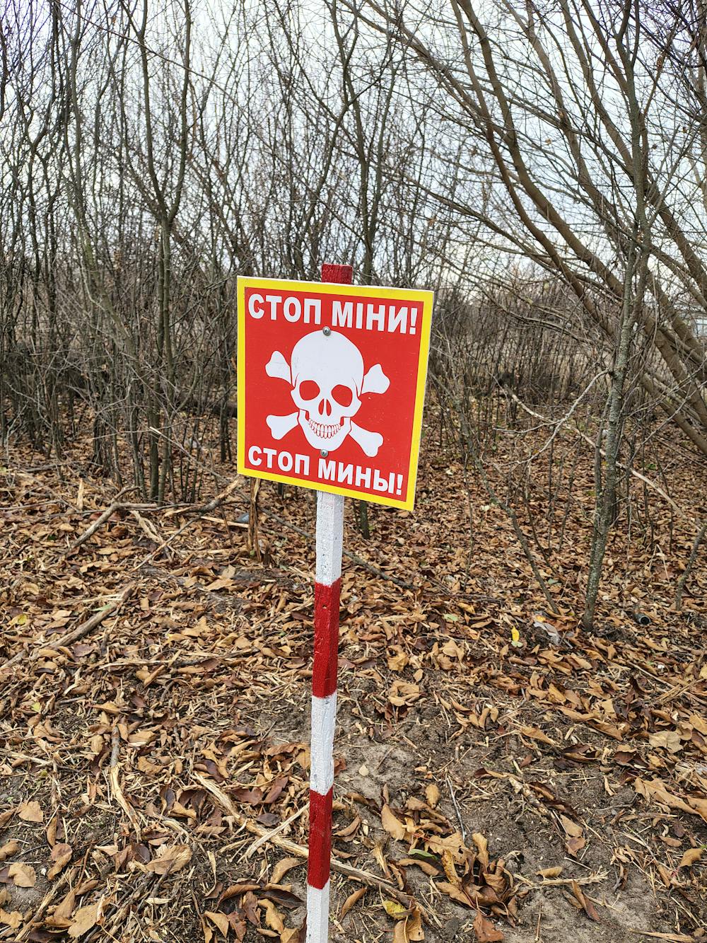 Навколо нас багато червоних та білих кілочків, за допомогою яких помічають раніше розчищені ділянки. А також можна побачити кілька вищих жовтих кілочків, що відзначають місця виявлення мін і боєприпасів, які не розірвалися. Поруч кілька поспіхом виритих російських окопів, у яких колись ховалися ворожі війська. А трохи далі — червоно-білий знак із характерним символом черепа та схрещених кісток зі словами: СТОП — МІНИ. Вихід за цю лінію кілочків може бути фатальним.