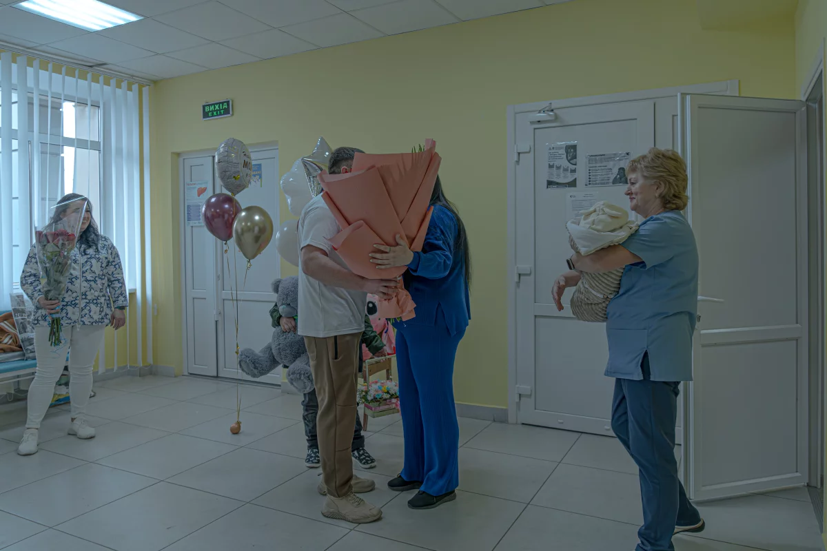Вагітна Христина Дещенко сидить у коридорі на лавці поруч зі своїм чоловіком Валентином. У неї почалися перейми. Подружжя родом зі сусіднього Краматорська, де російські ракетні удари за останні три роки вбили сотні мирних жителів. Подружжя дуже хвилюється за безпеку своєї першої дитини і вважає, що майбутнє не віщує нічого доброго для Донецької області. Вони планують переїхати у безпечніше місце подалі на захід, наприклад, до передмістя Києва.