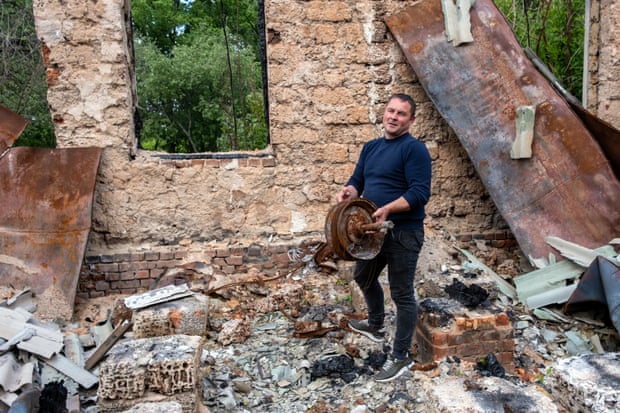 Хоча він знайшов робітників, щоб покласти новий дах на зерносховищі, його офіс зруйнували. Тепер фермер зберігає тут свій трактор, подалі від дронів.