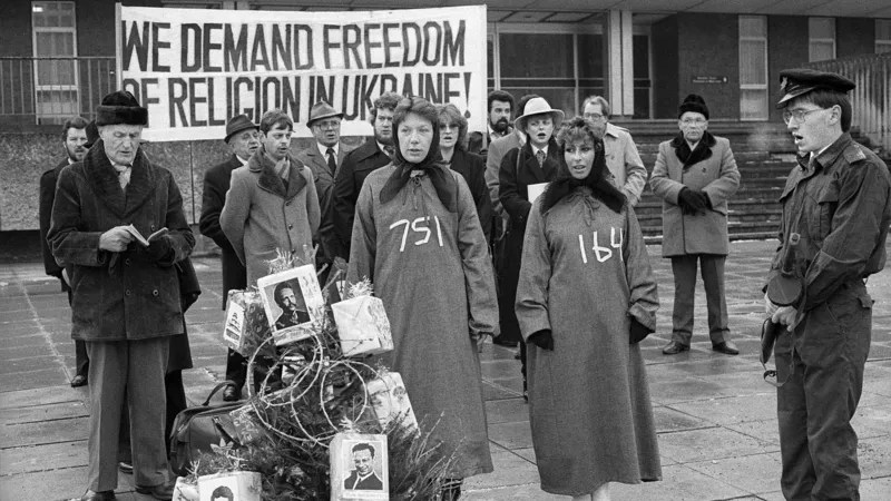 Члени української громади Бредфорда, одягнені як в’язні ГУЛАГу та їхня радянська охорона, проводять Різдвяну панахиду за ув’язненими у СРСР за сповідування своєї віри у 1986 році / Фото: Tim Smith