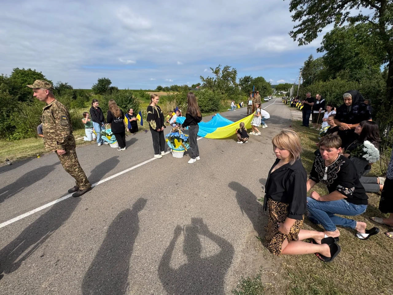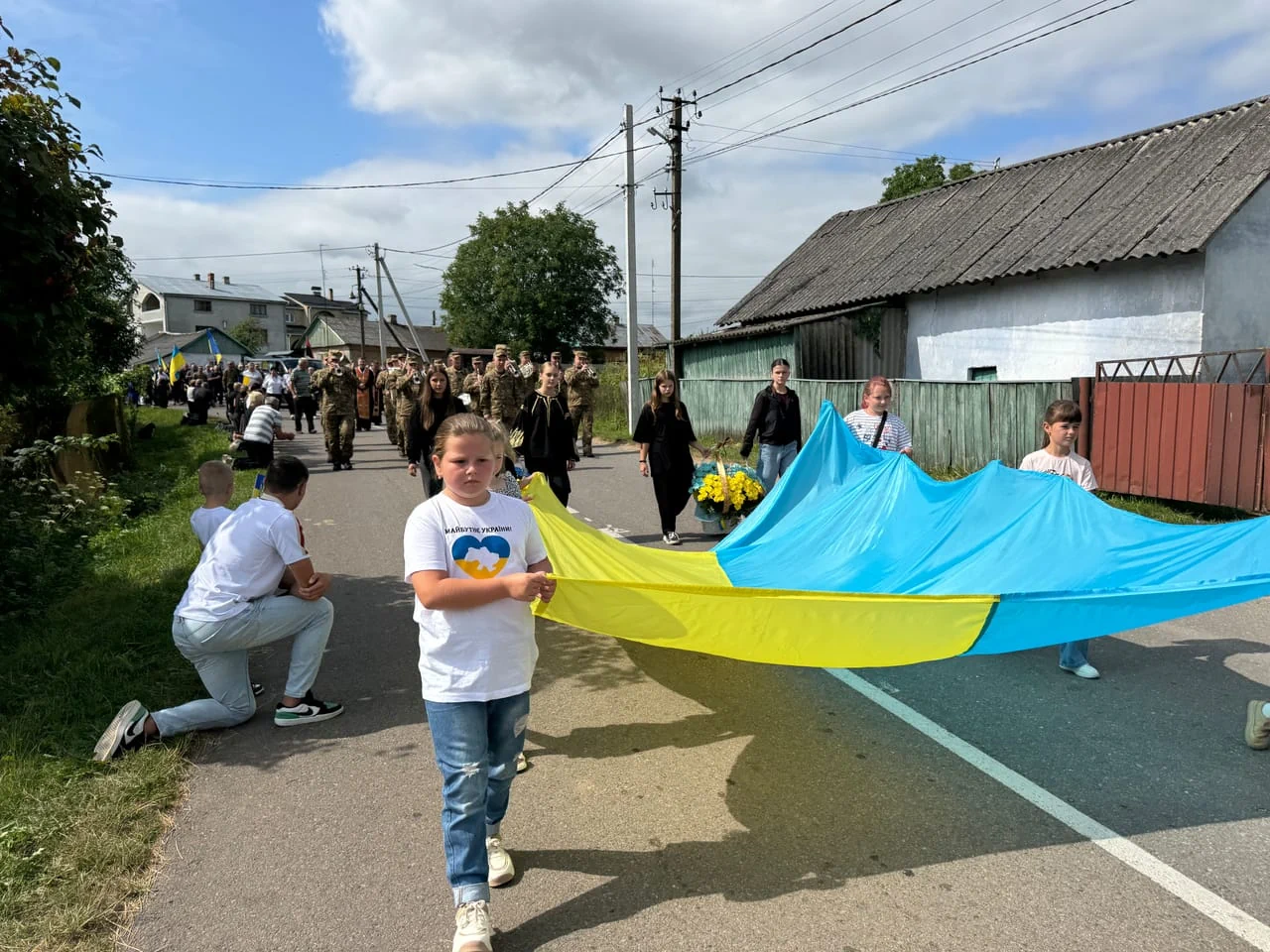 Є майже всі 600 мешканців. Оркестр Романа Вовка марширує перед труною. Декілька дітей несуть український прапор.