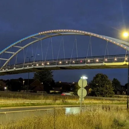 18 Жовтня, 202518 Жовтня, 2025 Володимир Тиравський У Великобританії на пішохідному мосту зависло освітлення у синьо-жовтих кольорах українського прапора