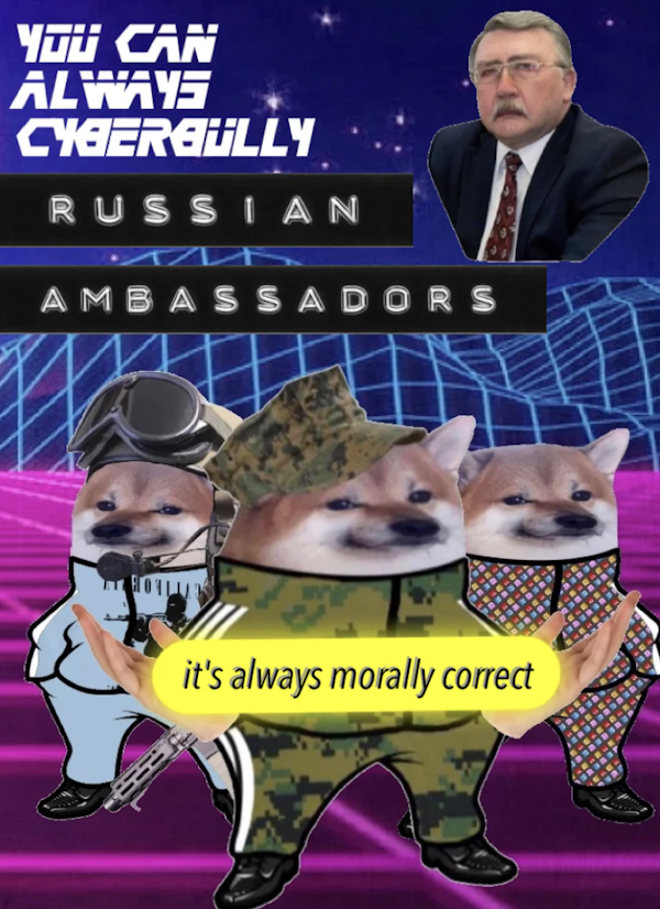 На зображенні можна побачити двох собак і напис, що кібербулінг російських послів завжди морально правильний.