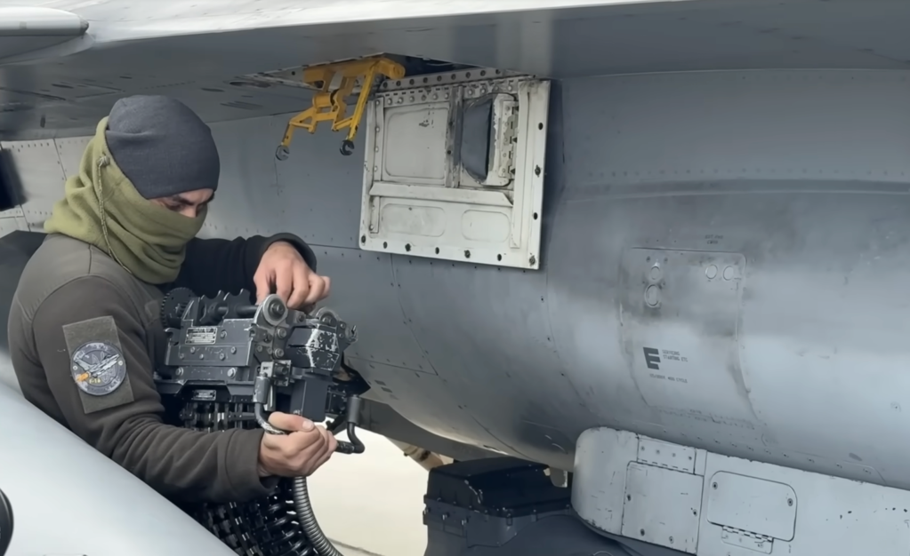 Зброяр заряджає 20-мм боєприпаси для гармати M61A1 винищувача F-16 / Скріншот із архіву ВПС України