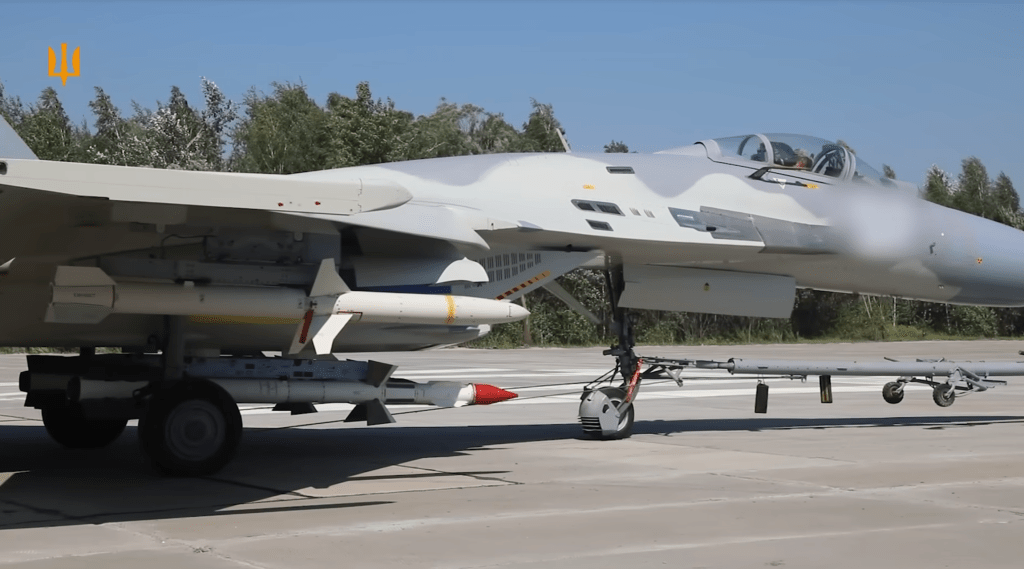 Цікавим доповненням до відео з F-16 став цей Су-27 Фланкер, озброєний ракетами класу «повітря-повітря» AGM-88 HARM і R-27ER, у новітньому двоколірному сірому камуфляжному забарвленні / Скріншот ВПС України