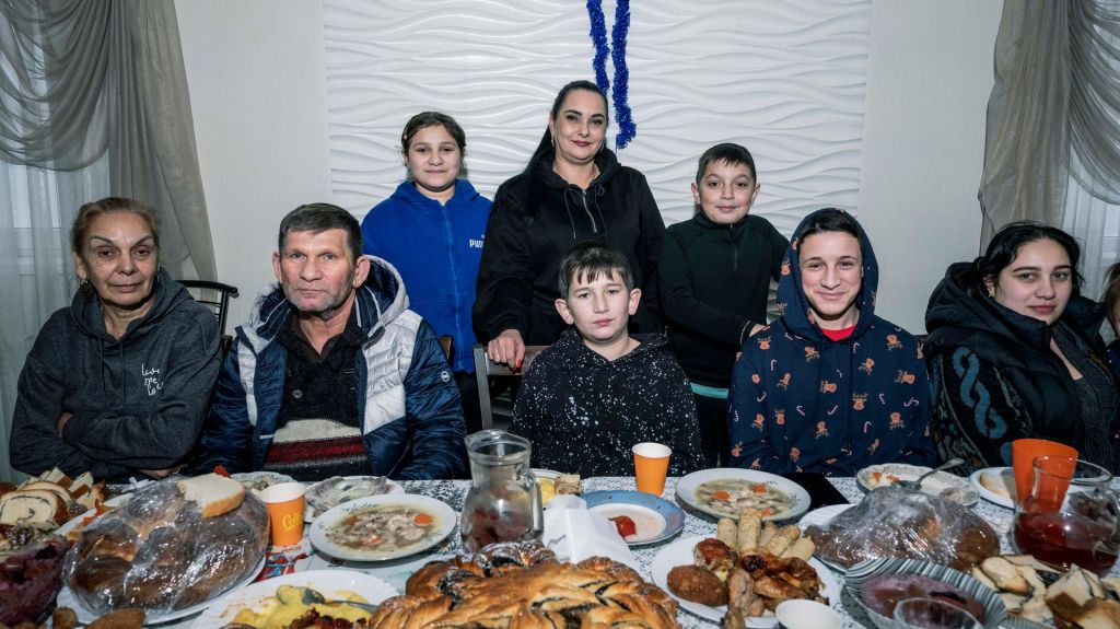 «Для нас Ісус народився за старою датою», — каже Костянтин Кузнєцов, 61-річний ром зі Слов’янська, який сидить за столом з десятьма іншими біженцями зі сходу України.